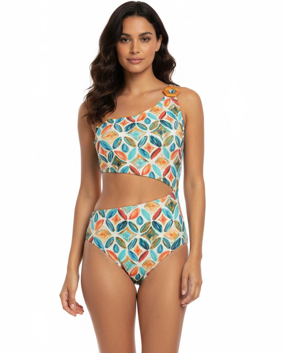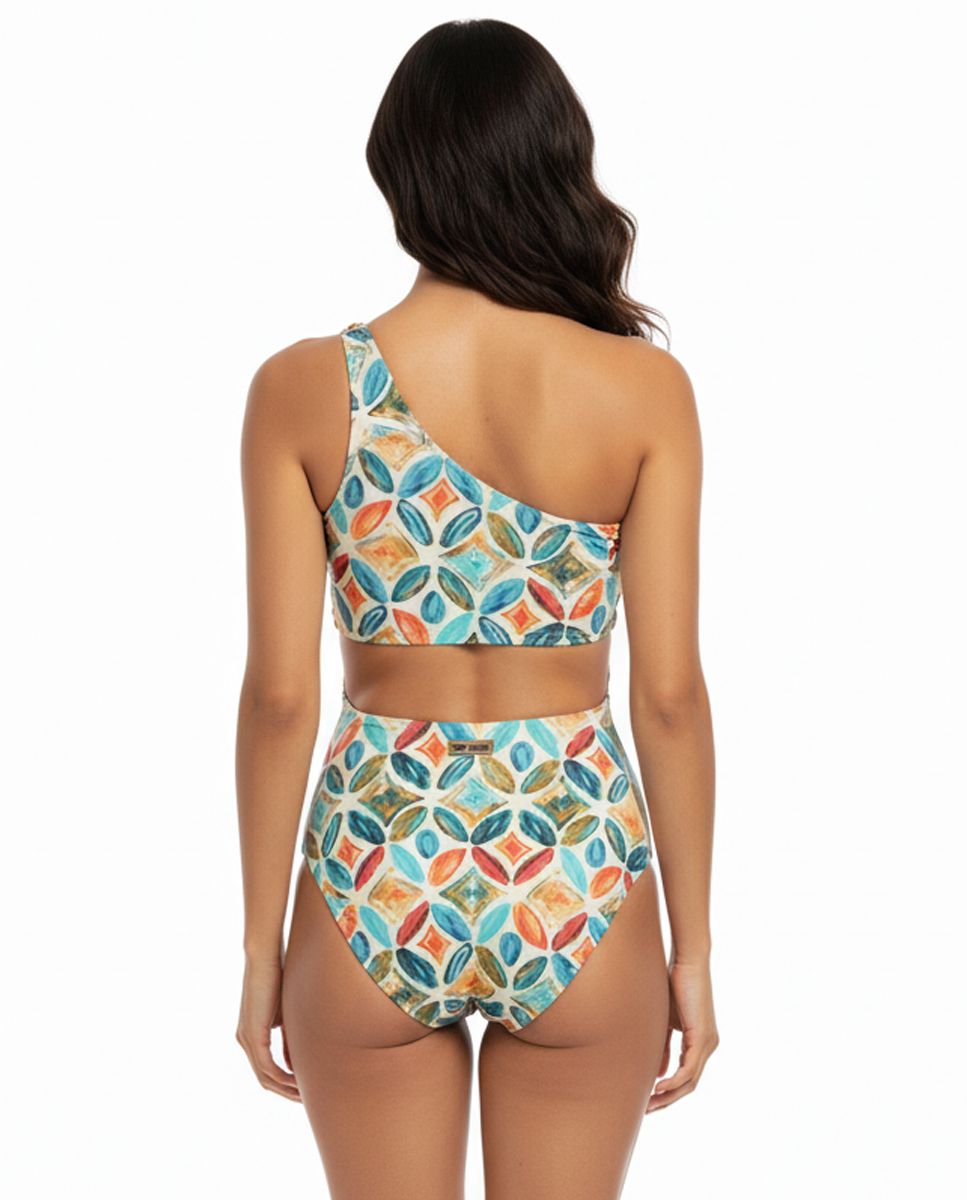 Bañador asimétrico con un original estampado geométrico en tonos vivos. Su diseño de un solo tirante con detalle decorativo realza la figura y aporta un toque moderno y diferente. Perfecto para lucir cómoda, segura y con mucho estilo este verano.