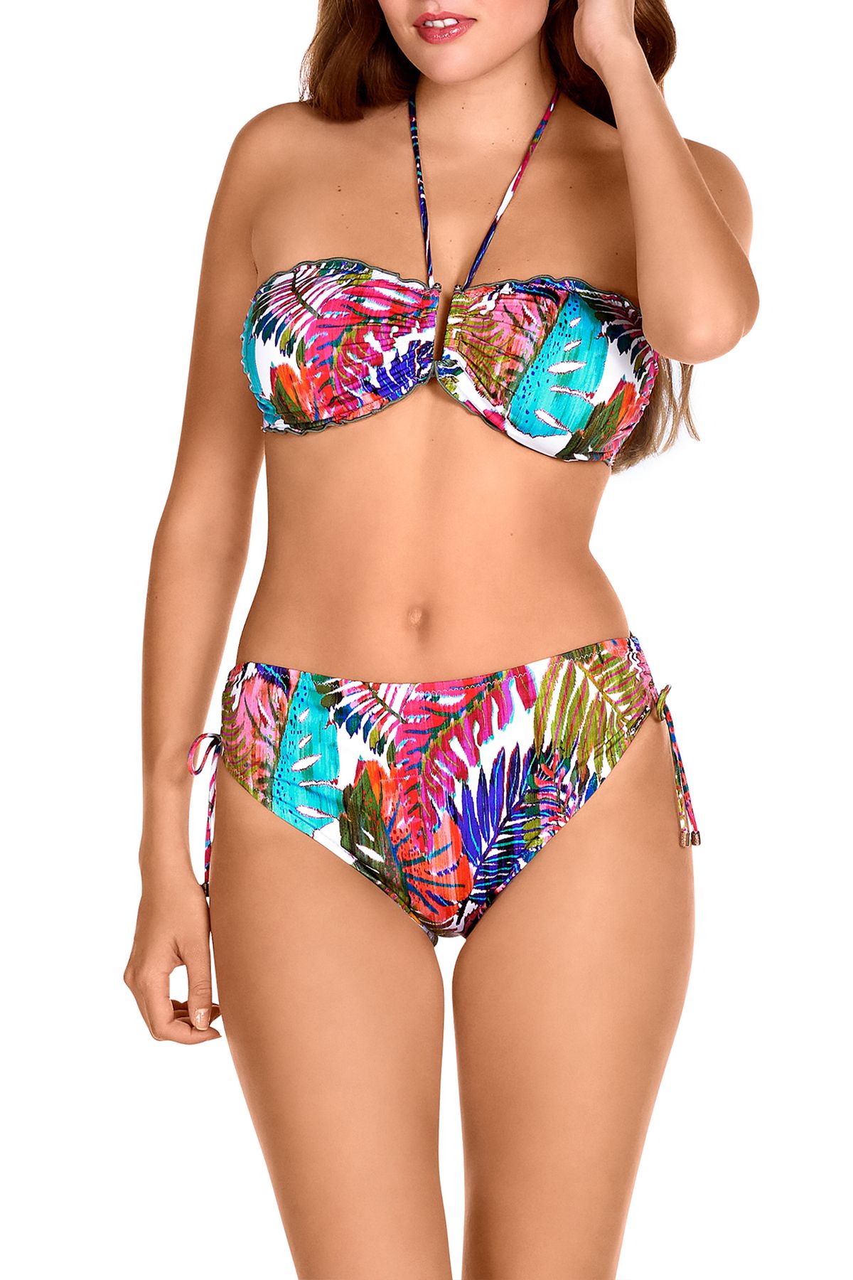 Nos encanta este bikini en forma bandeau con aros "E", es ideal para mujeres con mucho pecho ya que tiene mayor capacidad y también es perfecto para tomar el sol y que no te queden marcas, gracias a sus aros recoge el pecho de maravilla y se aguanta perfectamente sin los tirantes. La braguita es de tiro alto y cobertura completa, mide unos 4-5 dedos aprox de alto el lateral. Lleva unas tiras para poder regular la altura. El estampado tropical multicolor favorece a todo tipo de pieles.