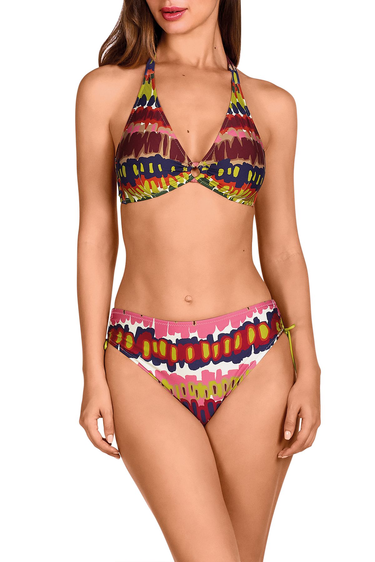Este bikini es precioso!, su forma de top tipo halter sienta de maravilla y se adapta perfectamente a todo tipo de pecho, lleva copas suaves por lo que recoge muy bien, gracias a su escote en pico estiliza y favorece la figura. Los tirantes son multiposición, podrás llevarlos atados al cuello o al hombro.La braguita es de tiro alto y cobertura completa, tiene unas tiras laterales que te permiten regular la altura y ajustarla a la medida que más te guste.