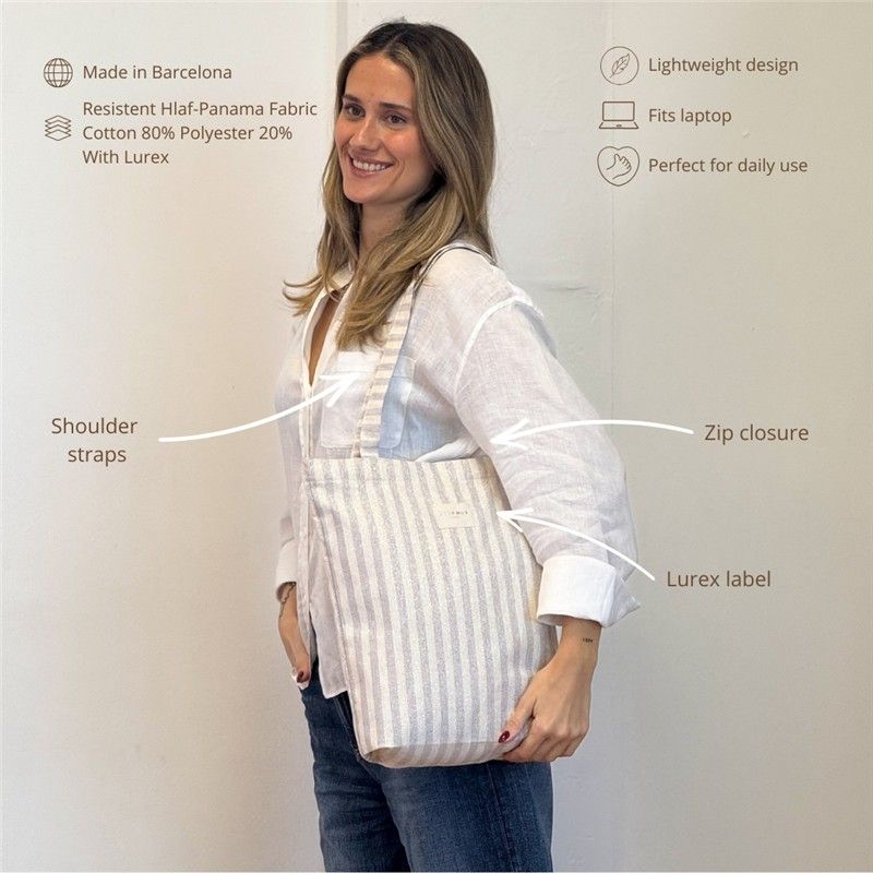 !Compacta, Cómoda y con Mucho Estilo¡ Si buscas una "tote bag" original, práctica y con personalidad, esta bolsa es tu nueva favorita. Está confeccionada con tejido fino de half-panamá de alta calidad, su tejido resistente mantiene la forma y garantiza durabilidad. El estampado a rayas de color lila con toques de lurex la convierte en el complemento perfecto para tus outfits. CIERRE SEGURO CON CREMALLERA. Incluye cremallera superior, ideal para llevar tus pertenencias protegidas. Es perfecta para el día a día, para ir a trabajar, de compras o escaparte a la playa sin preocupaciones. FÁCIL DE LAVAR Y MANTENER. Sabemos que las bolsas del día a día necesitan practicidad. Por eso esta "tote bag" es fácil de lavar, pensada para acompañarte en todos tus planes sin complicaciones. CONFECCIONADA EN ESPAÑA. Elaborada con telas nacionales y fabricación en España, apostando por la calidad, el cuidado en los detalles y la producción responsable.