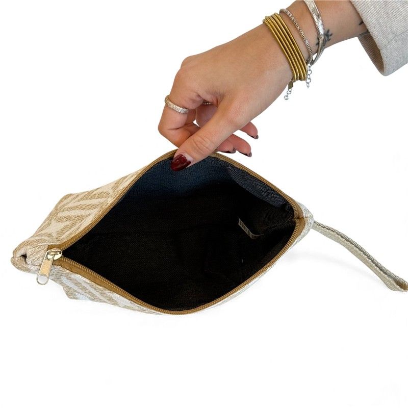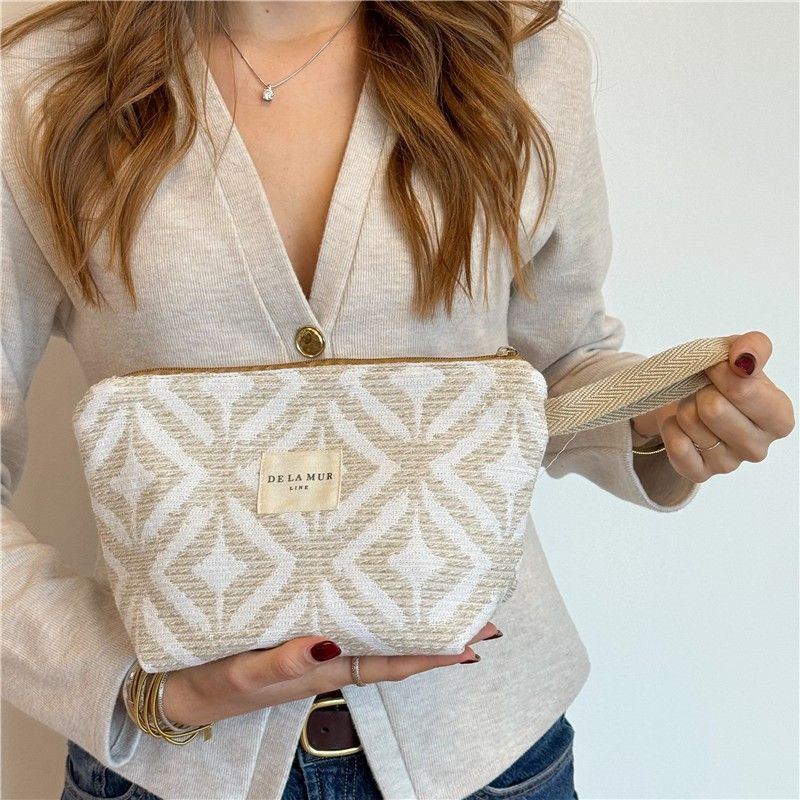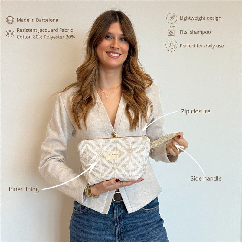 ¿Buscas el neceser perfecto para acompañarte en tu día a día? ¡Lo acabas de encontrar!Este neceser grande combina diseño, calidad y funcionalidad para que lleves todo lo que necesitas. Gracias a su formato práctico y su asa lateral, podrás llevarlo cómodamente en la mano o dentro del bolso, mochila o maleta.Está confeccionado en tejido jacquard de alta calidad, su textura gruesa aporta estructura y durabilidad. El estampado GEOMÉTRICO en tonos BEIGE y CRUDO combina con todo y añade ese toque alegre que transforma cualquier bolso. CREMALLERA SEGURA Y ASA LATERAL. Incluye cremallera superior resistente para mantener tus cosas bien protegidas y una asa lateral que facilita llevarlo en la mano o sacarlo cómodamente del bolso o maleta. Práctico y funcional, como nos gusta. MULTIUSOS PARA TODO. Este neceser es ideal para: Llevar tus imprescindibles a la playa, organizar pequeños productos de higiene, guardar maquillaje, cremas faciales, mantener el bolso ordenado, transportar pequeños accesorios. FÁCIL DE LAVAR. Es fácil de limpiar, pensado para acompañarte a todas partes sin complicaciones. CONFECCIONADO EN ESPAÑA. Elaborado con telas nacionales y fabricación en España, apostando por la calidad, el cuidado en los detalles y la producción responsable.