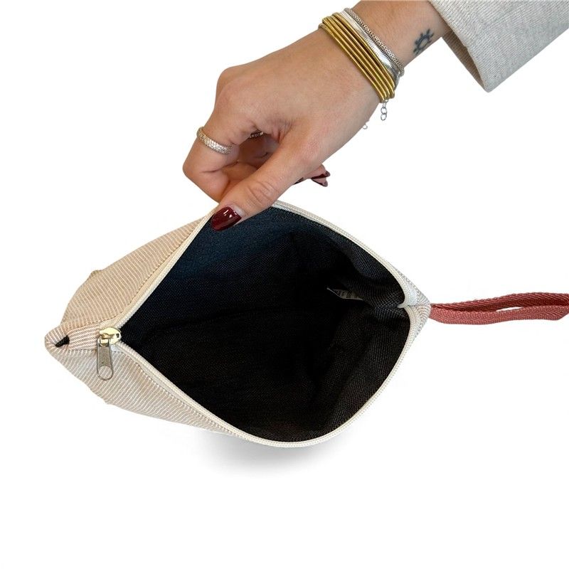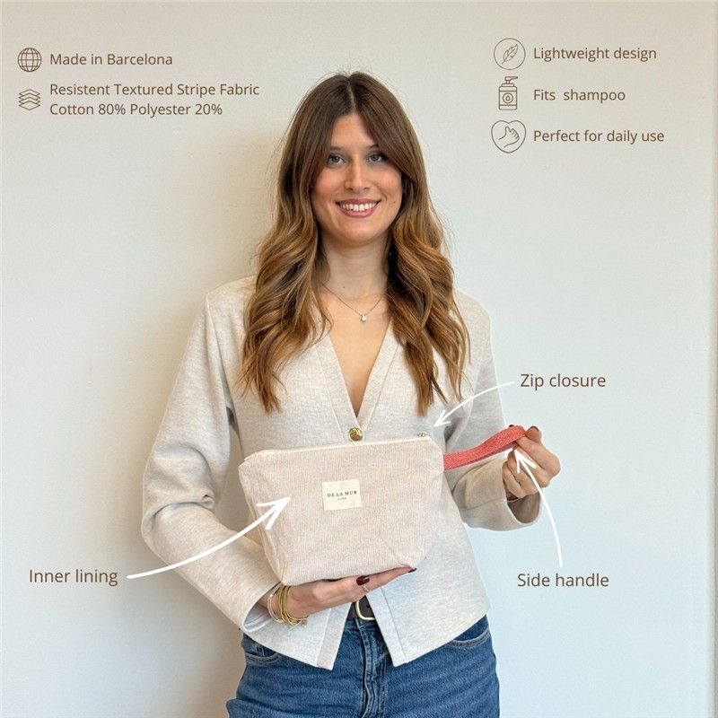 ¿Buscas el neceser perfecto para acompañarte en tu día a día? ¡Lo acabas de encontrar!Este neceser grande combina diseño, calidad y funcionalidad para que lleves todo lo que necesitas. Gracias a su formato práctico y su asa lateral, podrás llevarlo cómodamente en la mano o dentro del bolso, mochila o maleta. Está confeccionado en tejido con relieve de alta calidad, su textura aporta estructura y durabilidad. El estampado a RAYAS en tono ROSA clarito combina con todo y añade ese toque alegre que transforma cualquier bolso. CREMALLERA SEGURA Y ASA LATERAL. Incluye cremallera superior resistente para mantener tus cosas bien protegidas y una asa lateral que facilita llevarlo en la mano o sacarlo cómodamente del bolso o maleta. Práctico y funcional, como nos gusta. MULTIUSOS PARA TODO. Este neceser es ideal para: Llevar tus imprescindibles a la playa, organizar pequeños productos de higiene, guardar maquillaje, cremas faciales, mantener el bolso ordenado, transportar pequeños accesorios. FÁCIL DE LAVAR. Es fácil de limpiar, pensado para acompañarte a todas partes sin complicaciones. CONFECCIONADO EN ESPAÑA. Elaborado con telas nacionales y fabricación en España, apostando por la calidad, el cuidado en los detalles y la producción responsable.