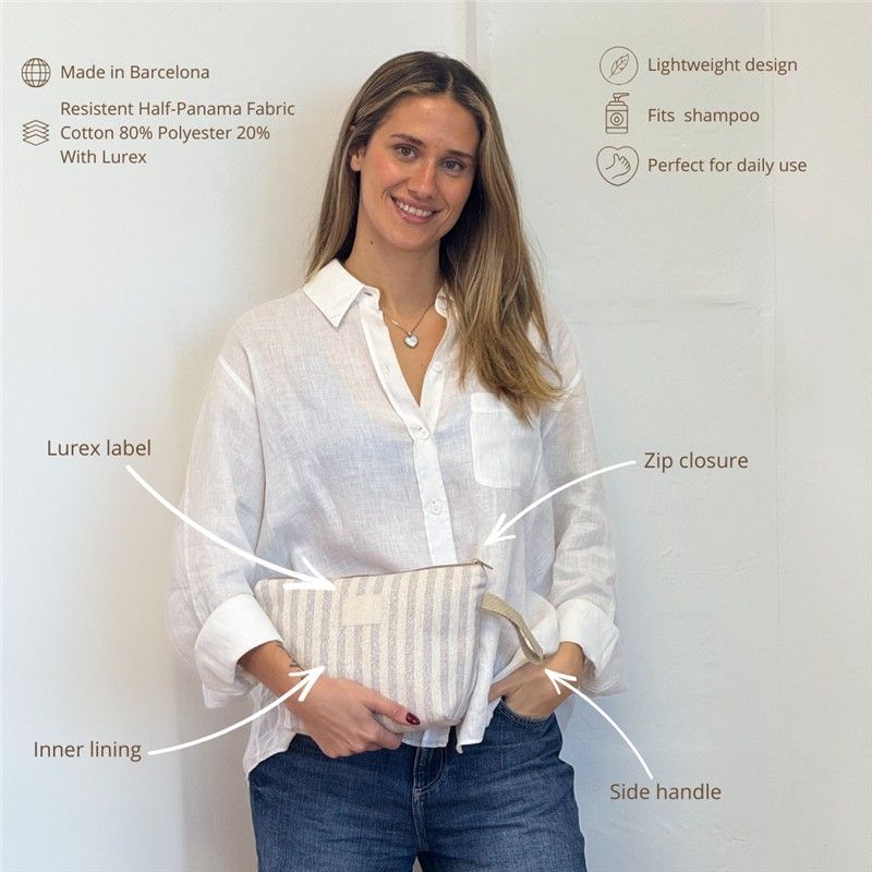 ¿Buscas el neceser perfecto para acompañarte en tu día a día? ¡Lo acabas de encontrar!Este neceser grande combina diseño, calidad y funcionalidad para que lleves todo lo que necesitas. Gracias a su formato práctico y su asa lateral, podrás llevarlo cómodamente en la mano o dentro del bolso, mochila o maleta.Está confeccionado en tejido fino half- panamá de alta calidad, su textura aporta estructura y durabilidad. El estampado a rayas color LILA con toques de lurex combina con todo y añade ese toque alegre que transforma cualquier bolso. CREMALLERA SEGURA Y ASA LATERAL. Incluye cremallera superior resistente para mantener tus cosas bien protegidas y una asa lateral que facilita llevarlo en la mano o sacarlo cómodamente del bolso o maleta. Práctico y funcional, como nos gusta. MULTIUSOS PARA TODO. Este neceser es ideal para: Llevar tus imprescindibles a la playa, organizar pequeños productos de higiene, guardar maquillaje, cremas faciales, mantener el bolso ordenado, transportar pequeños accesorios. FÁCIL DE LAVAR. Es fácil de limpiar, pensado para acompañarte a todas partes sin complicaciones. CONFECCIONADO EN ESPAÑA. Elaborado con telas nacionales y fabricación en España, apostando por la calidad, el cuidado en los detalles y la producción responsable.