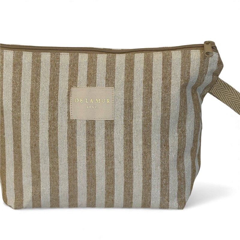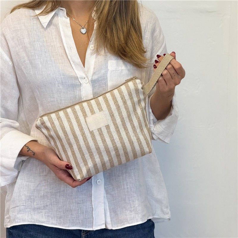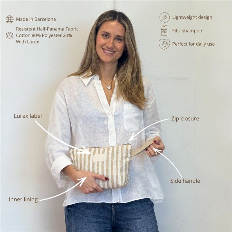 ¿Buscas el neceser perfecto para acompañarte en tu día a día? ¡Lo acabas de encontrar!Este neceser grande combina diseño, calidad y funcionalidad para que lleves todo lo que necesitas. Gracias a su formato práctico y su asa lateral, podrás llevarlo cómodamente en la mano o dentro del bolso, mochila o maleta. Está confeccionado en tejido fino half- panamá de alta calidad, su textura aporta estructura y durabilidad. El estampado a rayas color Mostaza con toques de lurex combina con todo y añade ese toque alegre que transforma cualquier bolso. CREMALLERA SEGURA Y ASA LATERAL. Incluye cremallera superior resistente para mantener tus cosas bien protegidas y una asa lateral que facilita llevarlo en la mano o sacarlo cómodamente del bolso o maleta. Práctico y funcional, como nos gusta. MULTIUSOS PARA TODO. Este neceser es ideal para: Llevar tus imprescindibles a la playa, organizar pequeños productos de higiene, guardar maquillaje, cremas faciales, mantener el bolso ordenado, transportar pequeños accesorios. FÁCIL DE LAVAR. Es fácil de limpiar, pensado para acompañarte a todas partes sin complicaciones. CONFECCIONADO EN ESPAÑA. Elaborado con telas nacionales y fabricación en España, apostando por la calidad, el cuidado en los detalles y la producción responsable.