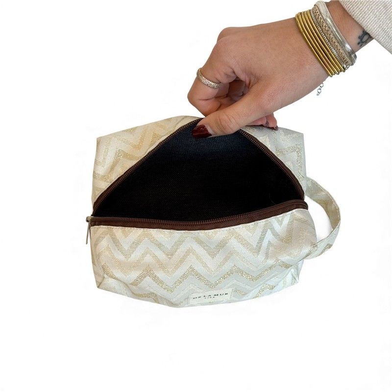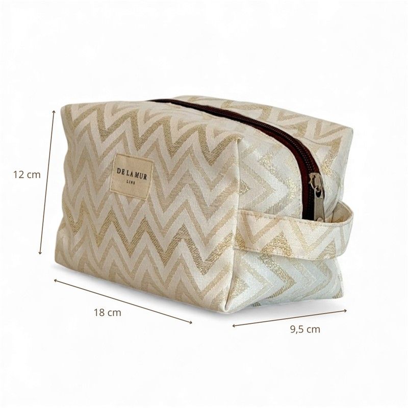 ¿Buscas el neceser perfecto para acompañarte en tu día a día? ¡Lo acabas de encontrar!Este neceser mediano combina diseño, calidad y funcionalidad para que lleves todo lo que necesitas. Gracias a su formato práctico y su asa lateral, podrás llevarlo cómodamente en la mano o dentro del bolso, mochila o maleta.Está confeccionado en tejido fino half-panamá de alta calidad, su textura gruesa aporta estructura y durabilidad. El estampado tipo ZIGZAG en lurex DORADO y fondo CRUDO, combina con todo y añade ese toque alegre que transforma cualquier bolso. CREMALLERA SEGURA Y ASA LATERAL. Incluye cremallera superior resistente para mantener tus cosas bien protegidas y una asa lateral que facilita llevarlo en la mano o sacarlo cómodamente del bolso o maleta. Práctico y funcional, como nos gusta. MULTIUSOS PARA TODO. Este neceser es ideal para: Llevar tus imprescindibles a la playa, organizar pequeños productos de higiene, guardar maquillaje, cremas faciales, mantener el bolso ordenado, transportar pequeños accesorios. FÁCIL DE LAVAR. Es fácil de limpiar, pensado para acompañarte a todas partes sin complicaciones. CONFECCIONADO EN ESPAÑA. Elaborado con telas nacionales y fabricación en España, apostando por la calidad, el cuidado en los detalles y la producción responsable.