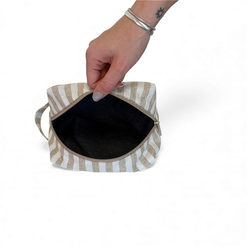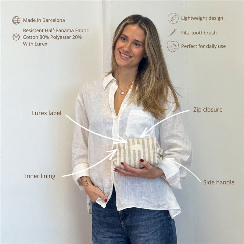 ¿Buscas el neceser perfecto para acompañarte en tu día a día? ¡Lo acabas de encontrar!Este neceser mediano combina diseño, calidad y funcionalidad para que lleves todo lo que necesitas. Gracias a su formato práctico y su asa lateral, podrás llevarlo cómodamente en la mano o dentro del bolso, mochila o maleta.Está confeccionado en tejido fino half-panamá de alta calidad, su textura gruesa aporta estructura y durabilidad. El estampado a RAYAS en color MOSTAZA con toques de lurex, combina con todo y añade ese toque alegre que transforma cualquier bolso. CREMALLERA SEGURA Y ASA LATERAL. Incluye cremallera superior resistente para mantener tus cosas bien protegidas y una asa lateral que facilita llevarlo en la mano o sacarlo cómodamente del bolso o maleta. Práctico y funcional, como nos gusta. MULTIUSOS PARA TODO. Este neceser es ideal para: Llevar tus imprescindibles a la playa, organizar pequeños productos de higiene, guardar maquillaje, cremas faciales, mantener el bolso ordenado, transportar pequeños accesorios. FÁCIL DE LAVAR. Es fácil de limpiar, pensado para acompañarte a todas partes sin complicaciones. CONFECCIONADO EN ESPAÑA. Elaborado con telas nacionales y fabricación en España, apostando por la calidad, el cuidado en los detalles y la producción responsable.