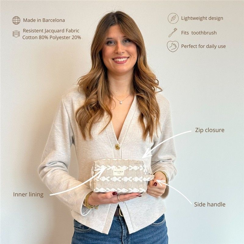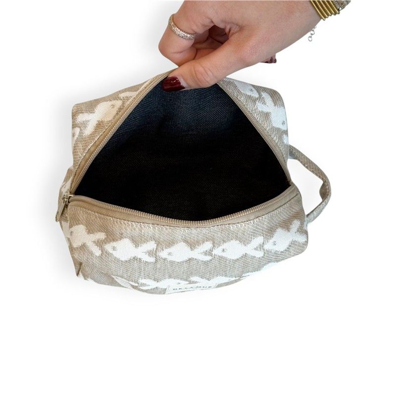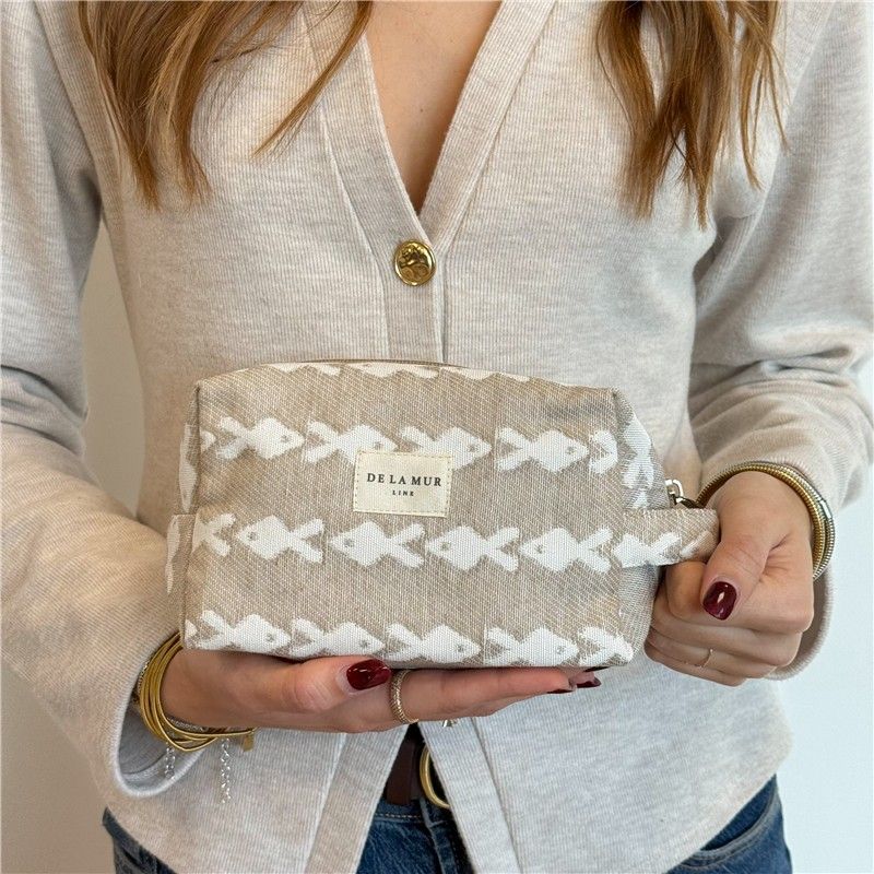 ¿Buscas el neceser perfecto para acompañarte en tu día a día? ¡Lo acabas de encontrar!Este neceser mediano combina diseño, calidad y funcionalidad para que lleves todo lo que necesitas. Gracias a su formato práctico y su asa lateral, podrás llevarlo cómodamente en la mano o dentro del bolso, mochila o maleta.Está confeccionado en tejido jacquard de alta calidad, su textura gruesa aporta estructura y durabilidad. El estampado de PECES en color CRUDO sobre fondo BEIGE, combina con todo y añade ese toque alegre que transforma cualquier bolso. CREMALLERA SEGURA Y ASA LATERAL. Incluye cremallera superior resistente para mantener tus cosas bien protegidas y una asa lateral que facilita llevarlo en la mano o sacarlo cómodamente del bolso o maleta. Práctico y funcional, como nos gusta. MULTIUSOS PARA TODO. Este neceser es ideal para: Llevar tus imprescindibles a la playa, organizar pequeños productos de higiene, guardar maquillaje, cremas faciales, mantener el bolso ordenado, transportar pequeños accesorios. FÁCIL DE LAVAR. Es fácil de limpiar, pensado para acompañarte a todas partes sin complicaciones. CONFECCIONADO EN ESPAÑA. Elaborado con telas nacionales y fabricación en España, apostando por la calidad, el cuidado en los detalles y la producción responsable.