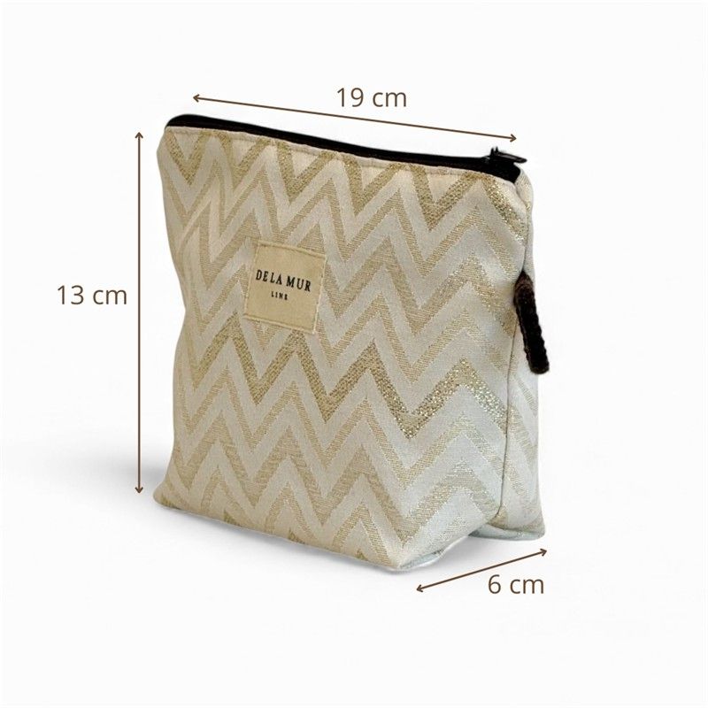 Neceser Práctico, Bonito y Multiusos! Si eres de las que necesitan tenerlo todo organizado (pero con estilo), este neceser te va a conquistar. Compacto y resistente, está confeccionado en tejido fino de half-panama de alta calidad, su textura aporta estructura y durabilidad. El estampado tipo ZIGZAG en lurex DORADO sobre fondo crudo combina con todo y añade ese toque alegre que transforma cualquier bolso. CREMALLERA SEGURA Y CORDÓN LATERAL. Incluye cremallera superior resistente para mantener tus cosas bien protegidas y un cordón lateral que facilita llevarlo en la mano o sacarlo cómodamente del bolso o maleta. Práctico y funcional, como nos gusta. MULTIUSOS PARA TODO. Este neceser es ideal para: Llevar tus imprescindibles a la playa, organizar pequeños productos de higiene, guardar maquillaje, mantener el bolso ordenado, transportar pequeños accesorios. FÁCIL DE LAVAR. Es fácil de limpiar, pensado para acompañarte a todas partes sin complicaciones. CONFECCIONADO EN ESPAÑA. Elaborado con telas nacionales y fabricación en España, apostando por la calidad, el cuidado en los detalles y la producción responsable.
