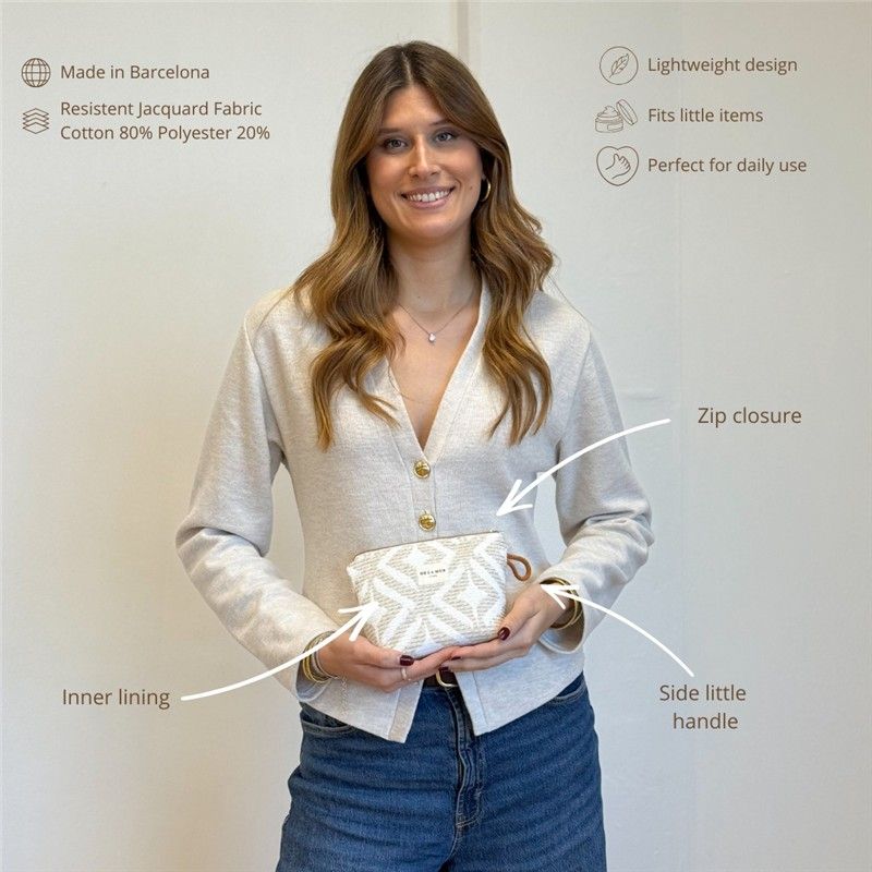 Neceser Práctico, Bonito y Multiusos! Si eres de las que necesitan tenerlo todo organizado (pero con estilo), este neceser te va a conquistar. Compacto y resistente, está confeccionado en tejido jacquard de alta calidad, su textura gruesa aporta estructura y durabilidad. El estampado GEOMÉTRICO en tonos BEIGE y CRUDO combina con todo y añade ese toque alegre que transforma cualquier bolso. CREMALLERA SEGURA Y CORDÓN LATERAL. Incluye cremallera superior resistente para mantener tus cosas bien protegidas y un cordón lateral que facilita llevarlo en la mano o sacarlo cómodamente del bolso o maleta. Práctico y funcional, como nos gusta. MULTIUSOS PARA TODO. Este neceser es ideal para: Llevar tus imprescindibles a la playa, organizar pequeños productos de higiene, guardar maquillaje, mantener el bolso ordenado, transportar pequeños accesorios. FÁCIL DE LAVAR. Es fácil de limpiar, pensado para acompañarte a todas partes sin complicaciones. CONFECCIONADO EN ESPAÑA. Elaborado con telas nacionales y fabricación en España, apostando por la calidad, el cuidado en los detalles y la producción responsable.