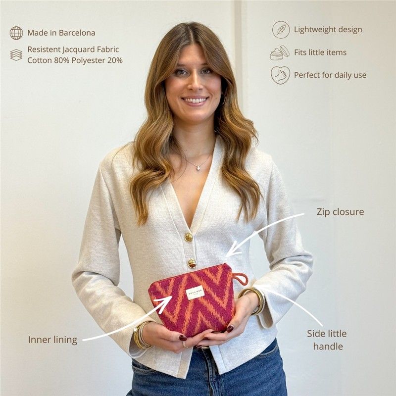 Neceser Práctico, Bonito y Multiusos! Si eres de las que necesitan tenerlo todo organizado (pero con estilo), este neceser te va a conquistar. Compacto y resistente, está confeccionado en tejido jacquard de alta calidad, su textura gruesa aporta estructura y durabilidad. El estampado tipo ZIGZAG en tonos ROSA FUCSIA y NARANJA combina con todo y añade ese toque alegre que transforma cualquier bolso. CREMALLERA SEGURA Y CORDÓN LATERAL. Incluye cremallera superior resistente para mantener tus cosas bien protegidas y un cordón lateral que facilita llevarlo en la mano o sacarlo cómodamente del bolso o maleta. Práctico y funcional, como nos gusta. MULTIUSOS PARA TODO. Este neceser es ideal para: Llevar tus imprescindibles a la playa, organizar pequeños productos de higiene, guardar maquillaje, mantener el bolso ordenado, transportar pequeños accesorios. FÁCIL DE LAVAR. Es fácil de limpiar, pensado para acompañarte a todas partes sin complicaciones. CONFECCIONADO EN ESPAÑA. Elaborado con telas nacionales y fabricación en España, apostando por la calidad, el cuidado en los detalles y la producción responsable.