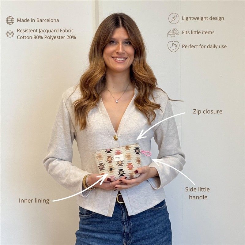 Neceser Práctico, Bonito y Multiusos! Si eres de las que necesitan tenerlo todo organizado (pero con estilo), este neceser te va a conquistar. Compacto y resistente, está confeccionado en tejido jacquard de alta calidad, su textura gruesa aporta estructura y durabilidad. El estampado GEOMÉTRICO en tonos ROSAS y NARANJA combina con todo y añade ese toque alegre que transforma cualquier bolso. CREMALLERA SEGURA Y CORDÓN LATERAL. Incluye cremallera superior resistente para mantener tus cosas bien protegidas y un cordón lateral que facilita llevarlo en la mano o sacarlo cómodamente del bolso o maleta. Práctico y funcional, como nos gusta. MULTIUSOS PARA TODO. Este neceser es ideal para: Llevar tus imprescindibles a la playa, organizar pequeños productos de higiene, guardar maquillaje, mantener el bolso ordenado, transportar pequeños accesorios. FÁCIL DE LAVAR. Es fácil de limpiar, pensado para acompañarte a todas partes sin complicaciones. CONFECCIONADO EN ESPAÑA. Elaborado con telas nacionales y fabricación en España, apostando por la calidad, el cuidado en los detalles y la producción responsable.