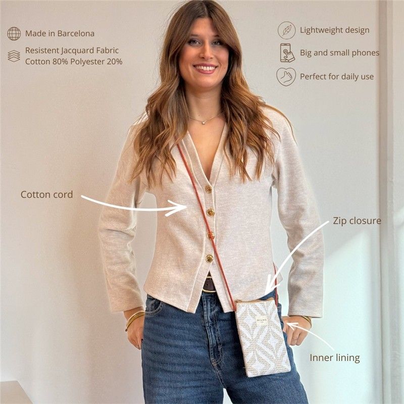 Ligero, práctico y siempre contigo. Este porta móvil de tela con asa larga es ese pequeño gran accesorio que te da libertad total. Cómodo, ligero y súper práctico, está pensado para llevar tu teléfono protegido… y tus manos libres. Combina diseño bonito y funcionalidad en un formato compacto ideal para el día a día. CREMALLERA SEGURA Y ASA LARGA. Asa larga para llevar cruzado o al hombro, comodidad total. Práctico y funcional, como nos gusta. TAMAÑO PERFECTO.Ideal para tu smartphone (incluso modelos grandes). Ligero y compacto, perfecto para paseos, viajes o eventos FÁCIL DE LAVAR. Es fácil de limpiar, pensado para acompañarte a todas partes sin complicaciones. CONFECCIONADO EN ESPAÑA. Elaborado con telas nacionales y fabricación en España, apostando por la calidad, el cuidado en los detalles y la producción responsable. El accesorio que no sabías que necesitabas. Minimalista, cómodo y funcional. Lo cuelgas, metes el móvil... y lista para salir.