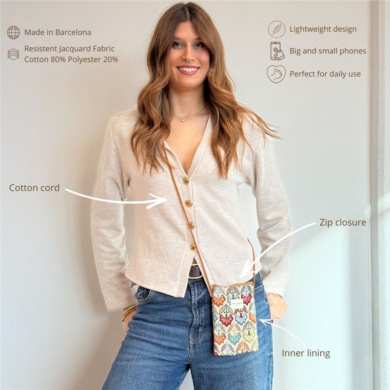 Ligero, práctico y siempre contigo. Este porta móvil de tela con asa larga es ese pequeño gran accesorio que te da libertad total. Cómodo, ligero y súper práctico, está pensado para llevar tu teléfono protegido… y tus manos libres. Combina diseño bonito y funcionalidad en un formato compacto ideal para el día a día. CREMALLERA SEGURA Y ASA LARGA. Asa larga para llevar cruzado o al hombro, comodidad total. Práctico y funcional, como nos gusta. TAMAÑO PERFECTO.Ideal para tu smartphone (incluso modelos grandes). Ligero y compacto, perfecto para paseos, viajes o eventos FÁCIL DE LAVAR. Es fácil de limpiar, pensado para acompañarte a todas partes sin complicaciones. CONFECCIONADO EN ESPAÑA. Elaborado con telas nacionales y fabricación en España, apostando por la calidad, el cuidado en los detalles y la producción responsable. El accesorio que no sabías que necesitabas. Minimalista, cómodo y funcional. Lo cuelgas, metes el móvil... y lista para salir.